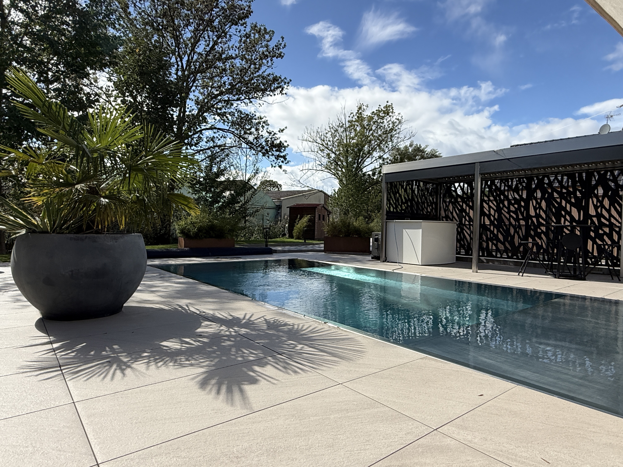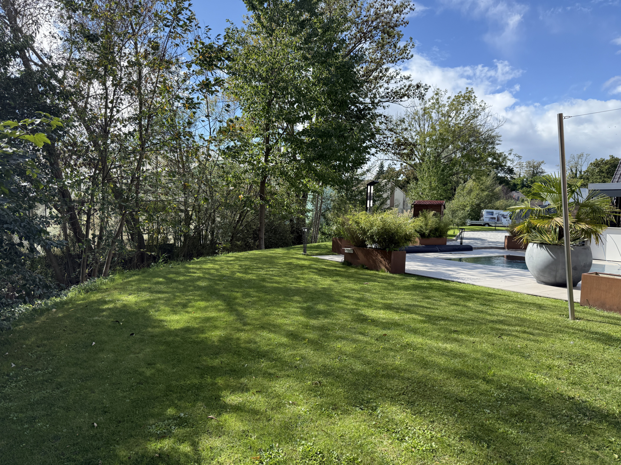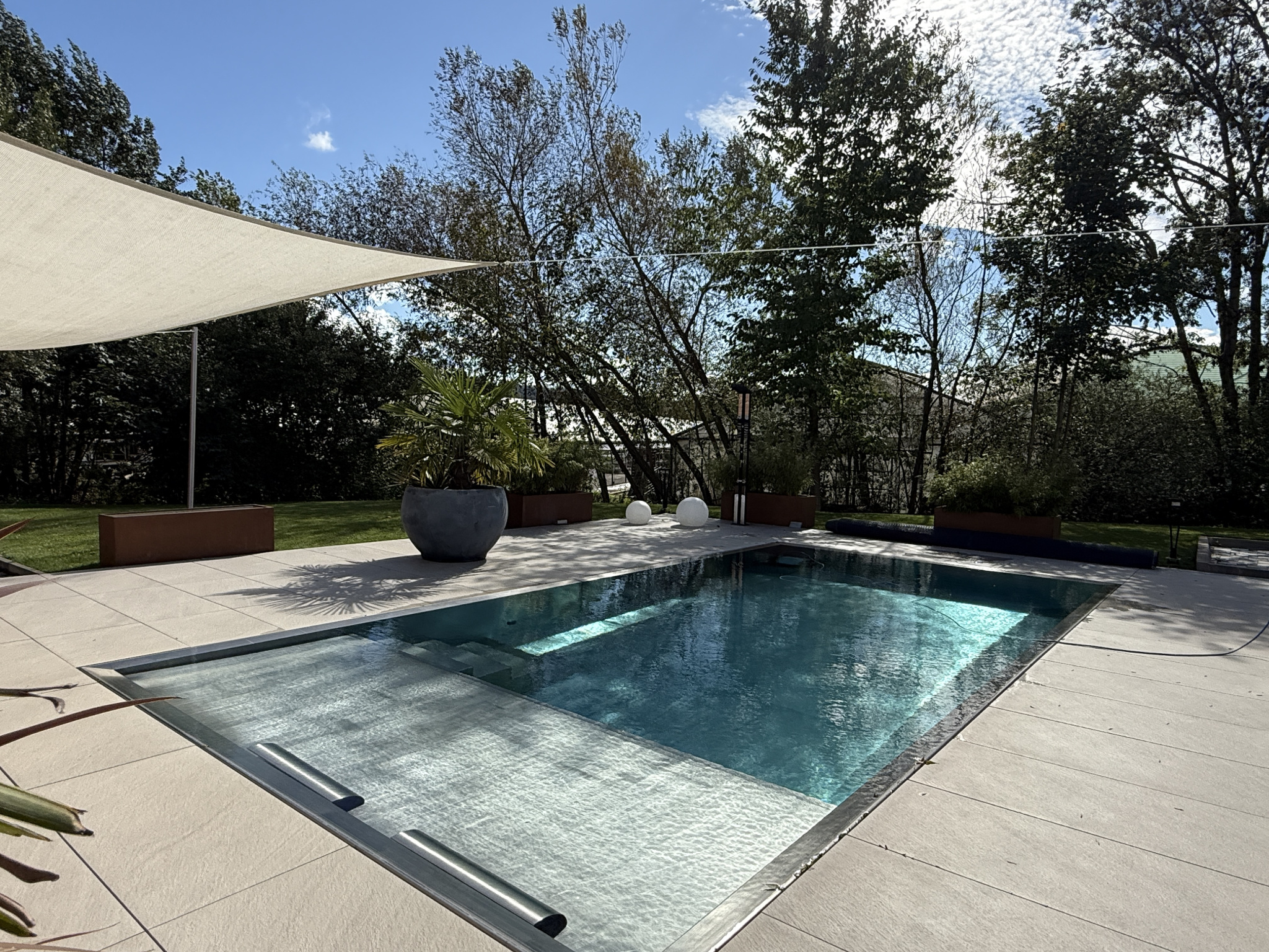 La conception moderne de ce bien se retrouve également dans le jardin paysagé, agrémenté d’une piscine miroir à débordement de 8×4m en INOX avec un escalier immergé et une plage de 1m50/4m, sécurisée et chauffée, une pergola inoxydable avec bar ainsi qu’une belle allée de 60m éclairée et pavée avec la possibilité de plusieurs stationnements.