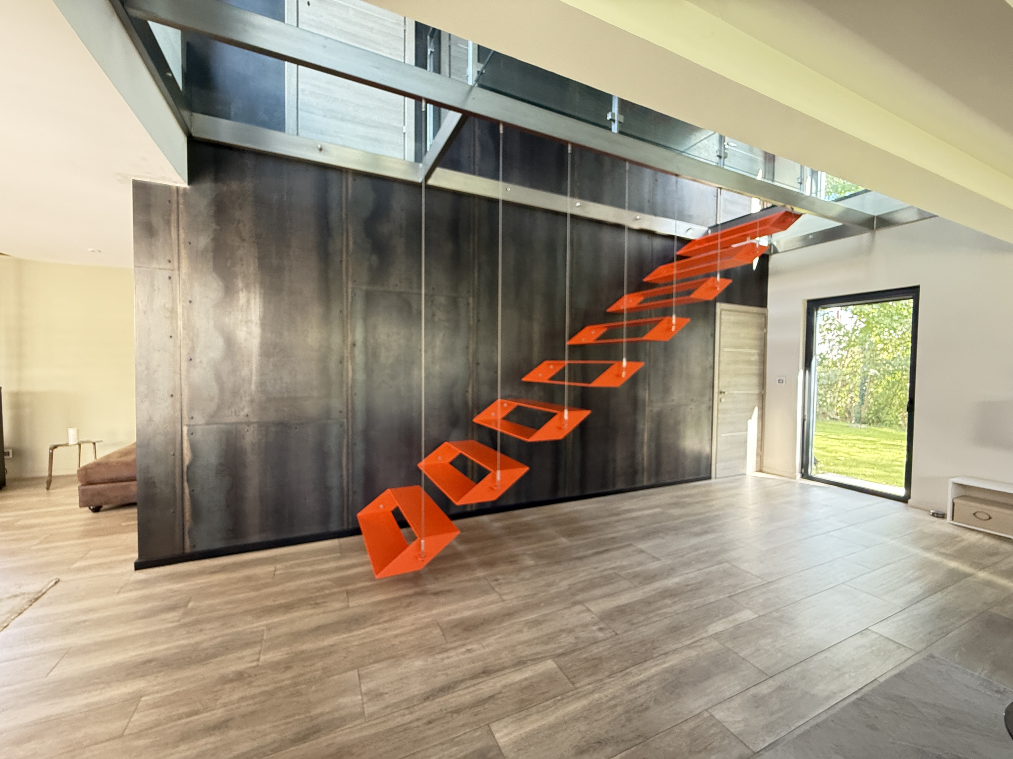Un escalier suspendu acier au design raffiné, associé à un plancher en verre sécurit, mène à l’étage où vous découvrirez deux chambres lumineuses et confortables ainsi qu’une salle d’eau agréable. La suite parentale offre une salle de bain haut de gamme avec douche à l’italienne et sa baignoire îlot, alliant modernité et raffinement.