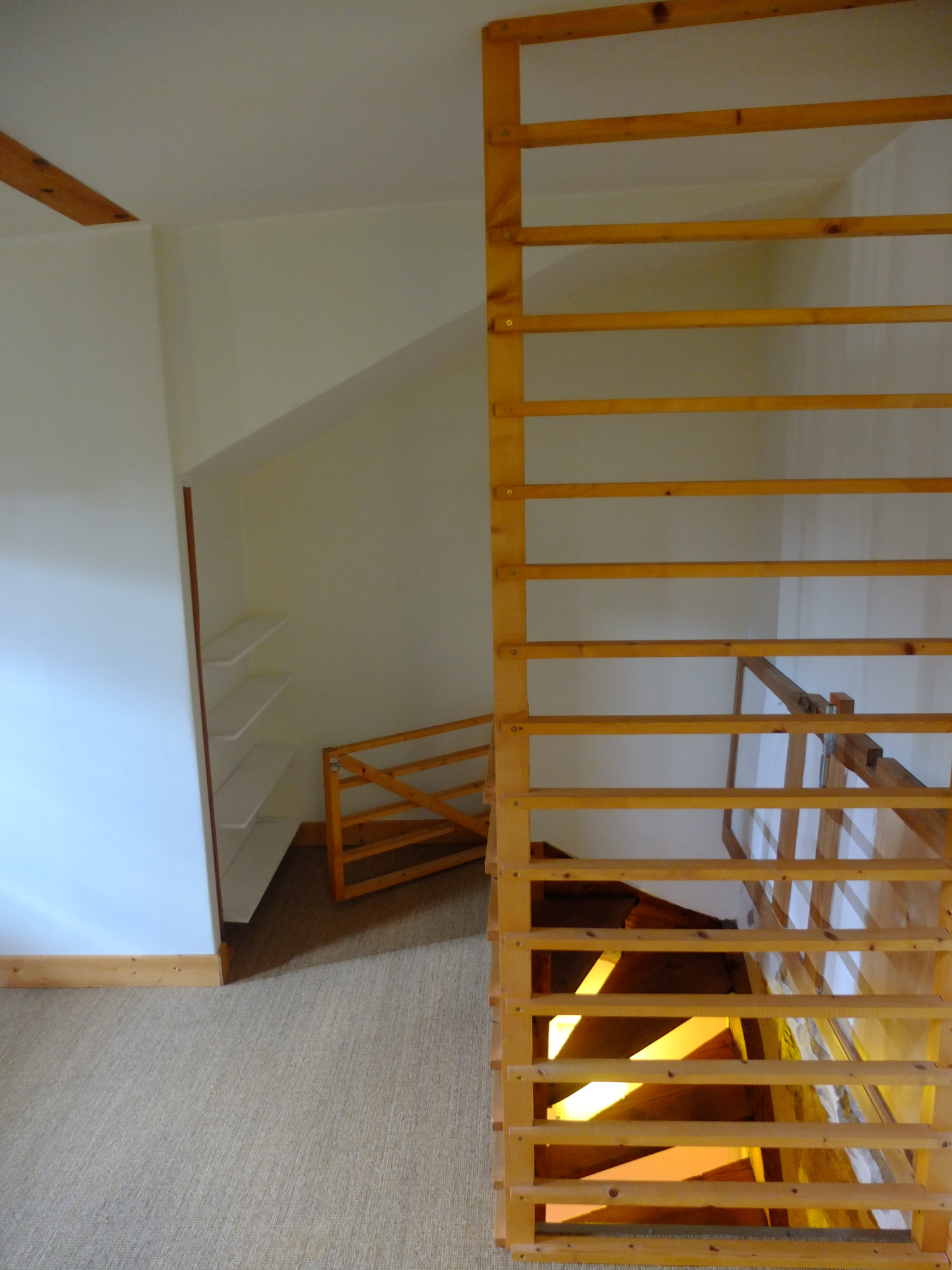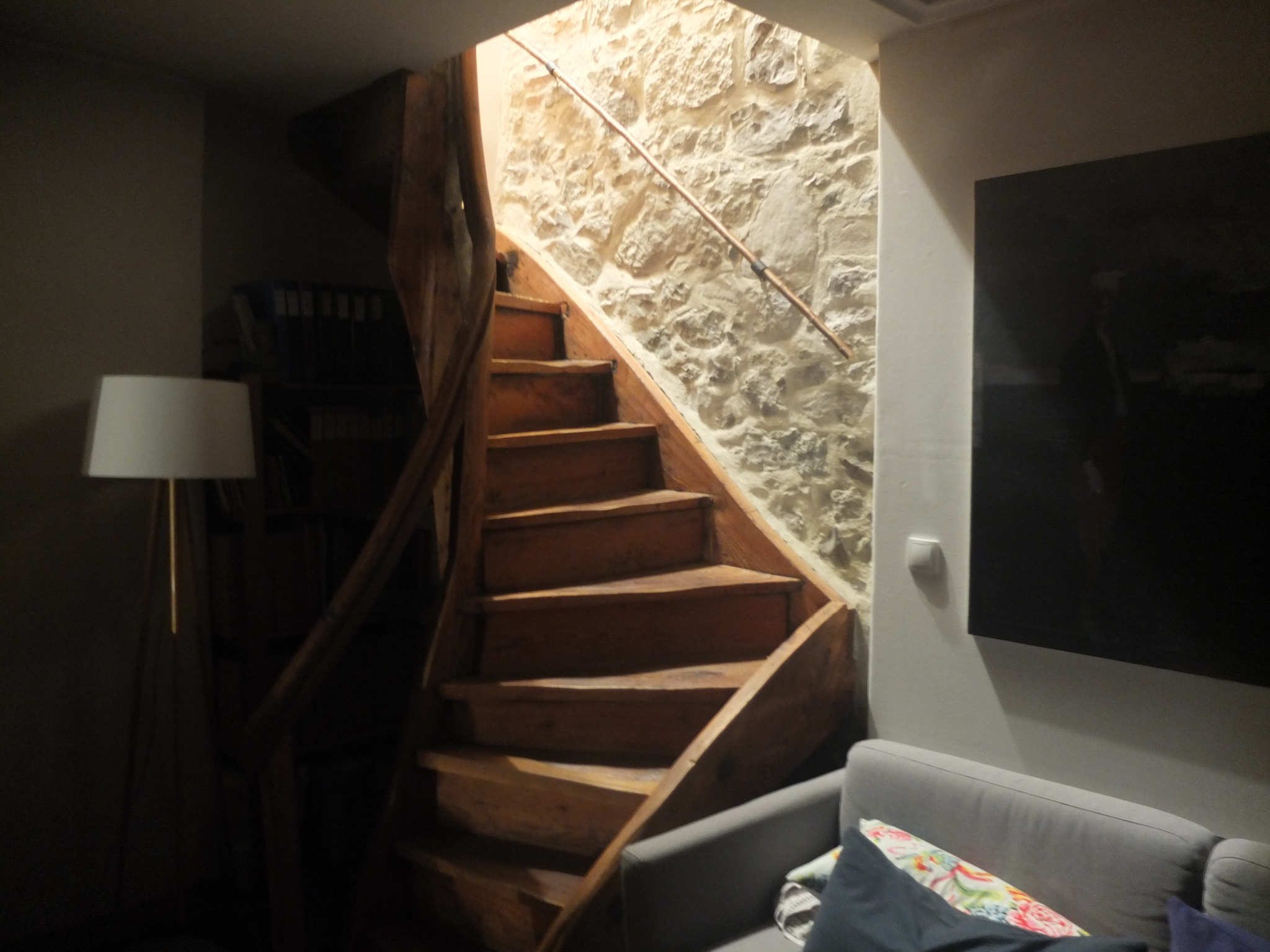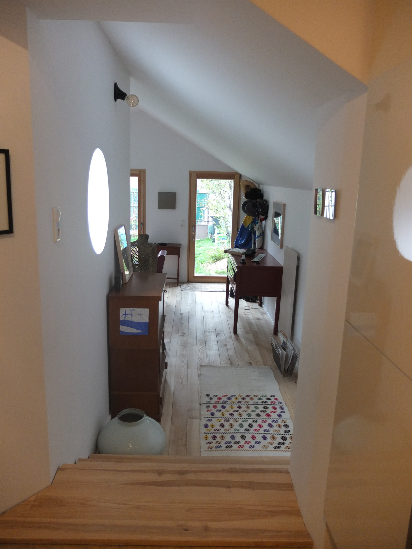 Triple vitrage, matériaux naturels (parquet frêne-olivier, liège isolant, pierre apparente)